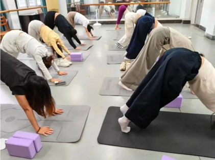 热身过程中,大家跟随呼吸的节奏,一吸一呼间,烦躁与疲惫渐渐消散。初次接触瑜伽的同学也在老师的引导下逐步放松了身体,专注地感受着肌肉的舒展与内心的安定。
